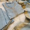 1 review for Sky Blue Silk Suit Set with Mirror Embroidery & Zari Dupatta – High-Quality Party & Wedding Attire